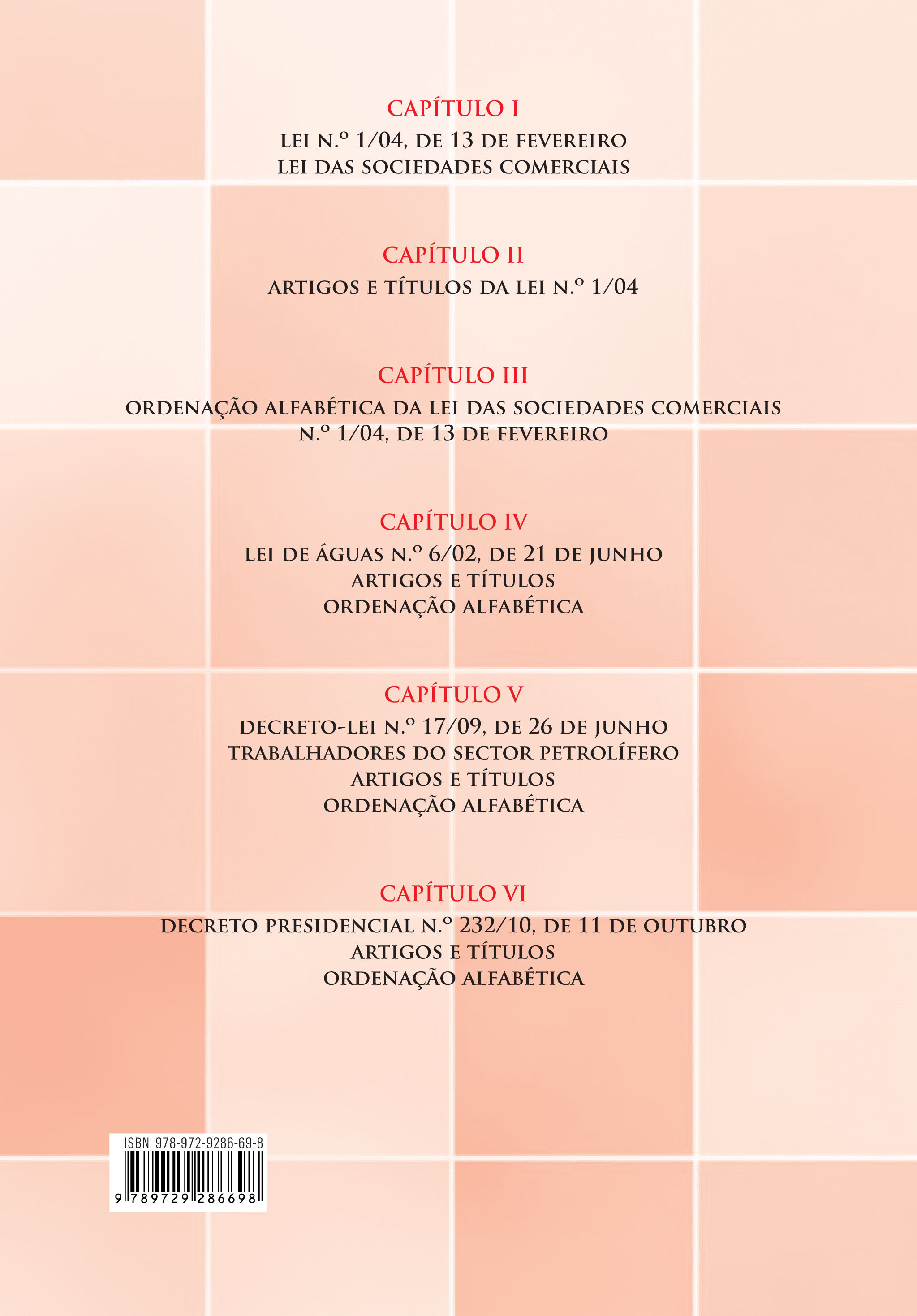 Lei das Sociedades Comerciais em Angola e algumas leis adicionais incluindo os Estatutos da OCPCA - Ordem dos Contabilistas e Perito Contabilistas de Angola. PÁGINAS CENTRAIS com UTIL índice por temas para facilitar a BUSCA de temas dentro da LSCA.
