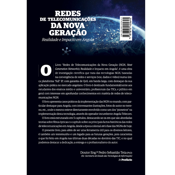 O livro “Redes de Telecomunicações da Nova Geração (NGN, Next Generation Networks); Realidade e Impacto em Angola”, é uma obra de investigação científica que trata das tecnologias NGN, baseadas na convergência de redes e serviços (voz, dados e vídeo) numa única plataforma “full” IP, com garantia de QoS, em banda larga, com destaque da sua aplicação prática no mercado angolano.