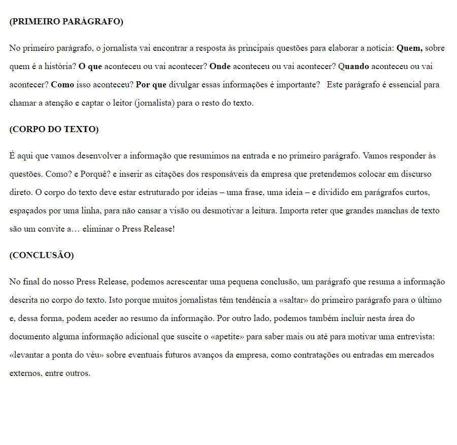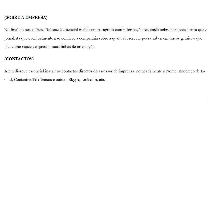 No final do nosso Press Release, podemos acrescentar uma pequena conclusão, um parágrafo que resuma a informação descrita no corpo do texto. Isto porque muitos jornalistas têm tendência a «saltar» do primeiro parágrafo para o último e, dessa forma, podem aceder ao resumo da informação. Por outro lado, podemos também incluir nesta área do documento alguma informação adicional que suscite o «apetite» para saber mais ou até para motivar uma entrevista: «levantar a ponta do véu» sobre eventuais futuros avanços da empresa, como contratações ou entradas em mercados externos, entre outros.